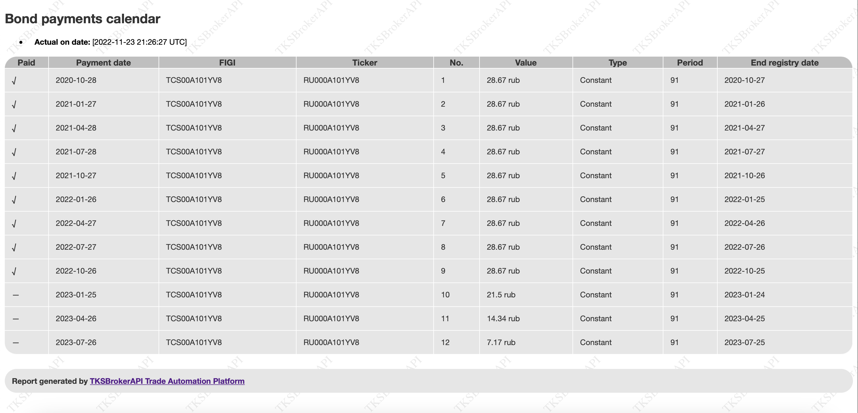 - `Paid` — выплачен ли уже купон (информация для удобства пользователя); - `Payment date` — дата платежа по купону; - `FIGI` — FIGI инструмента; - `Ticker` — тикер инструмента; - `Name` — человеко-читаемое название компании, которая выпустила облигации; - `No.` — номер купона; - `Value` — выплата на одну облигацию; - `Currency` — валюта, в которой будет выплачен купон; - `Coupon type` — тип купона (`Constant` — постоянный, `Floating` — плавающий, `Discount` — дисконт, `Mortgage` — ипотечный, `Fixed` — фиксированный, `Variable` — переменный и `Other` — прочее); - `Period` — количество дней в купонном периоде; - `End registry date` — дата фиксации реестра, до которой включительно нужно успеть купить облигацию, чтобы получить выплаты; - `Coupon start date` — начало купонного периода в часовом поясе UTC; - `Coupon end date` — окончание купонного периода в часовом поясе UTC.Пример генерируемого XLSX-файла с календарём выплат по облигациям, можно посмотреть здесь: ./docs/media/calendar.xlsx, а в виде Markdown-файла, здесь: ./docs/media/calendar.md. В случае, если календарь строится более чем для одной облигации, то платежи в один и тот же месяц группируются.