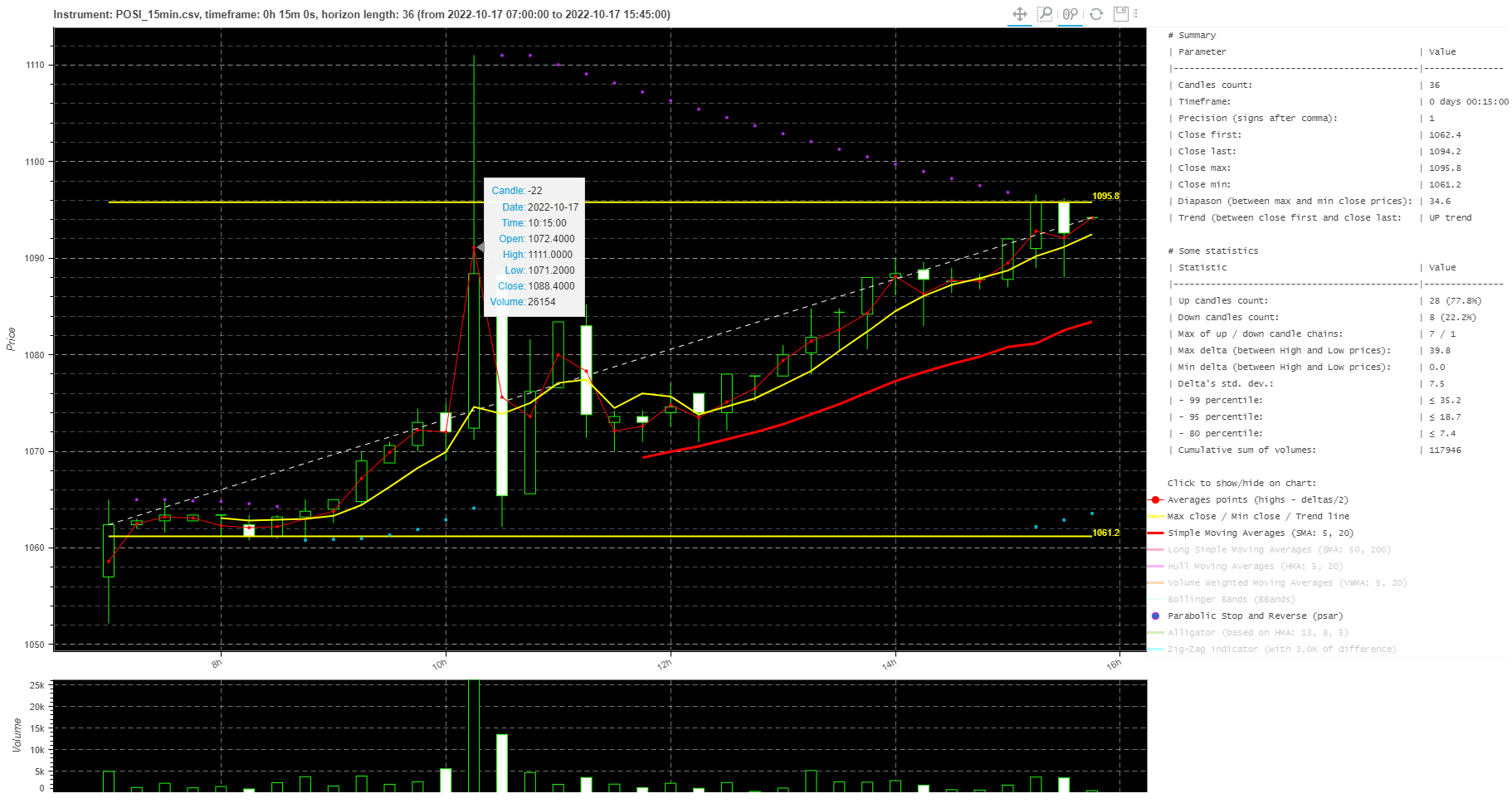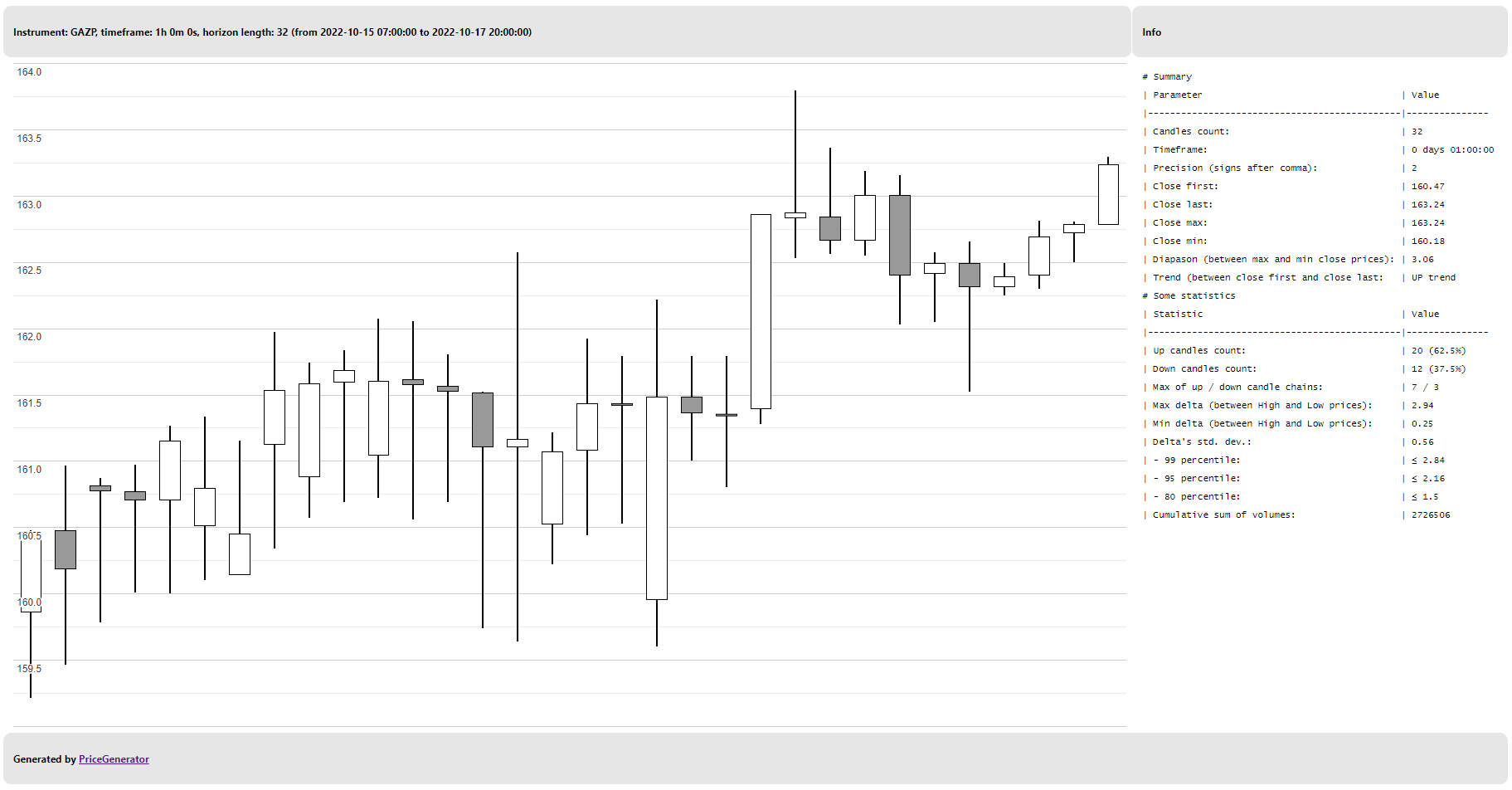 Построенные графики различного типа будут выглядеть как показано ниже (смотрите также реальные примеры под спойлерами). По умолчанию они сохраняются в файл index.html. На графиках дополнительно отображаются некоторые статистические значения и индикаторы, однако они представлены лишь для быстрого ознакомления с поведением цены в заданном диапазоне. Для проведения полноценных аналитических исследований и технического анализа рекомендуется использовать иные профессиональные средства.